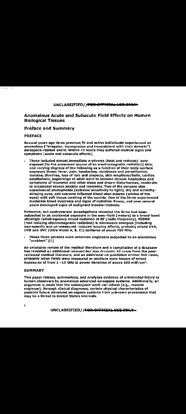 All but one of the 38 science papers/studies done for the previous DOD-based UFO program known informally as AATIP (Advanced Aerospace Threat Identification Program have had the text released publically via FOIA requests. The English tabloid The Sun was one such recipient and that lead to sensationalistic and lurid wording and headlines concerning unintended biological effects experienced by those experiencing encounters with unknown and advanced technological systems. Some screenshots from the paper stirring all this recent excitement: