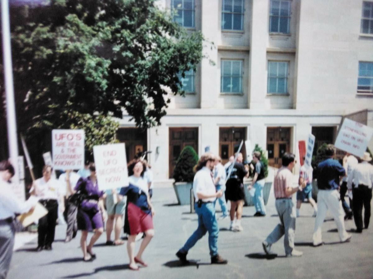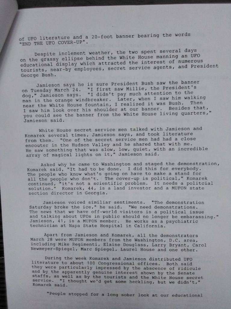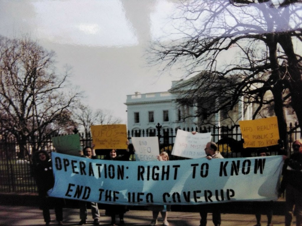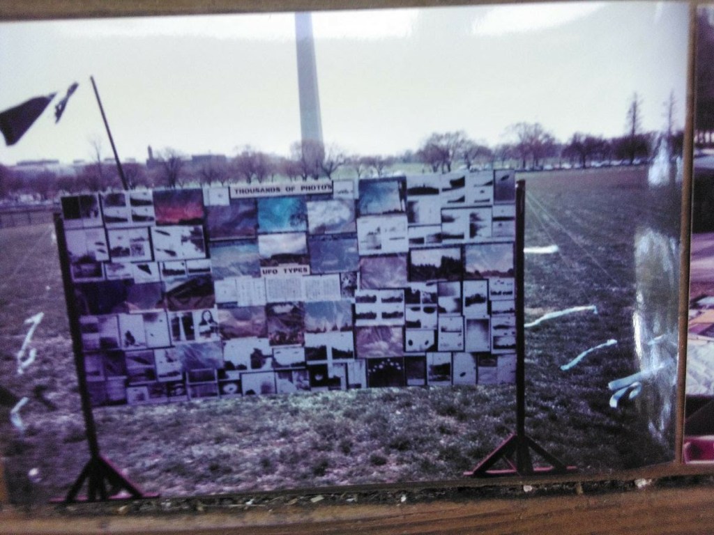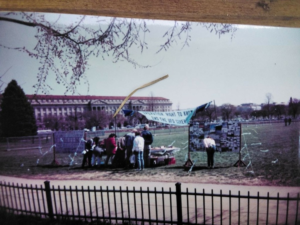 The following pictures were taken by Ed Komarek, Jr. First is a group photo Ed took at the White House sidewalk after a week-long, permitted educational display at the zero point of the White House ellipse. Pics following the first photo are scenes from the display (long table of material, upright display board, large banner on poles). Event during March 1992. Black and white version of White House sidewalk group photo adorned cover of the MUFON Journal during the spring of 1992.