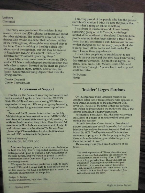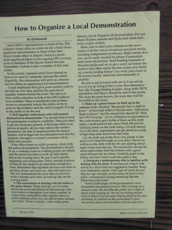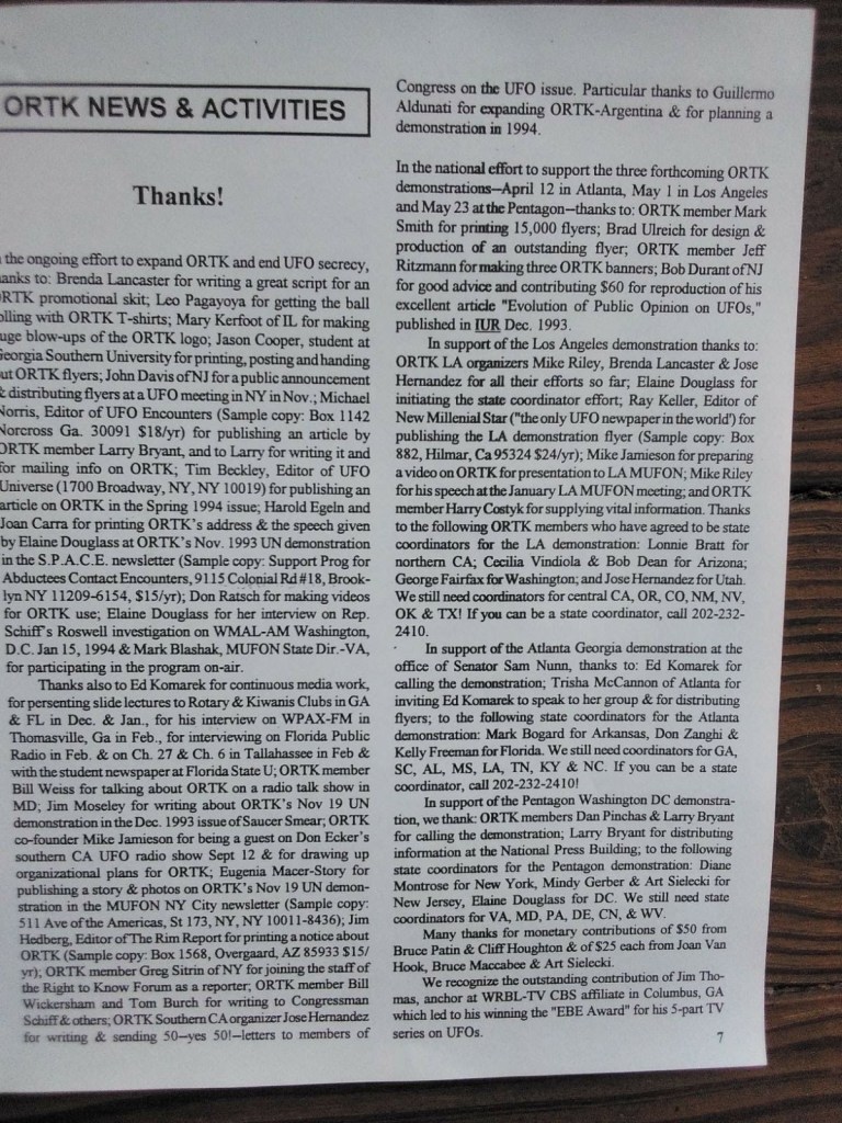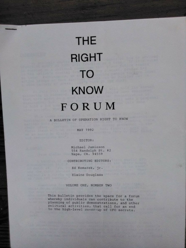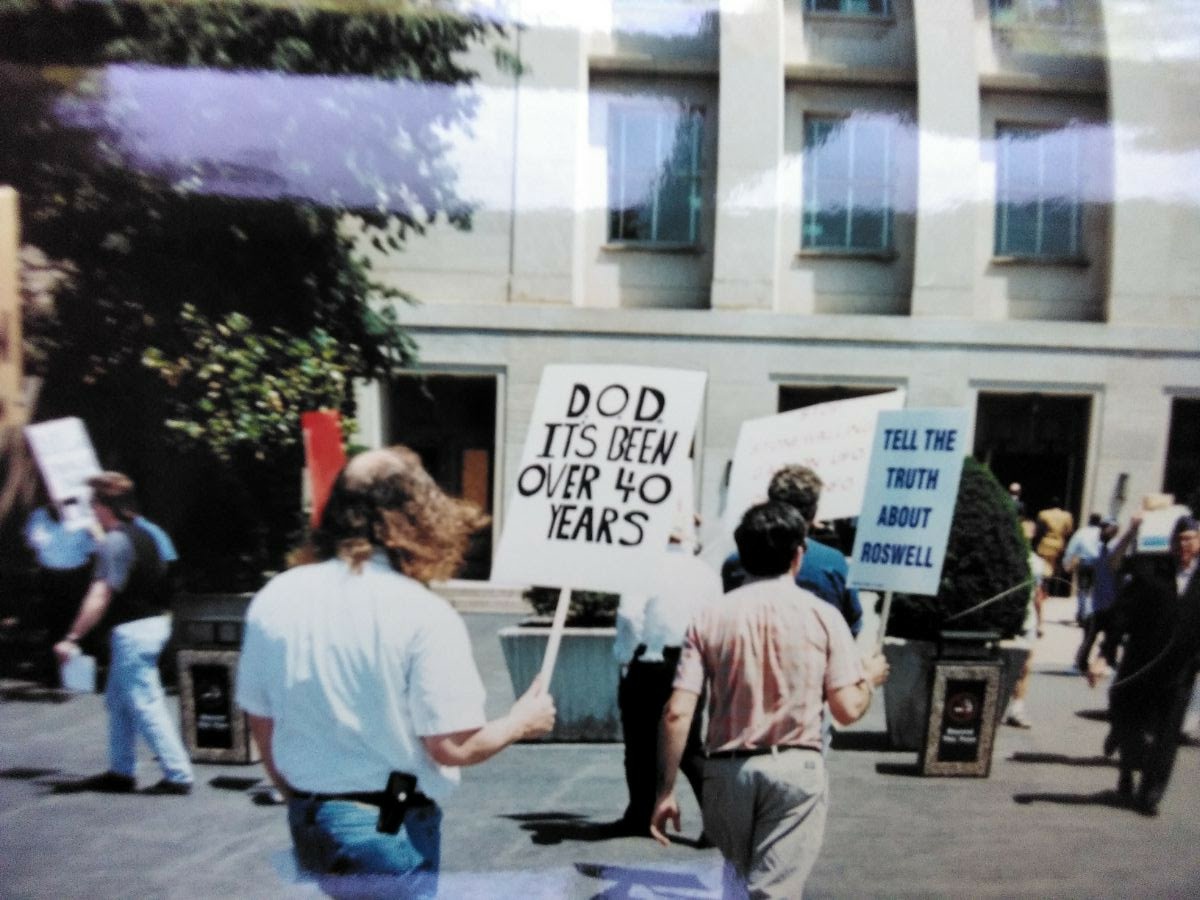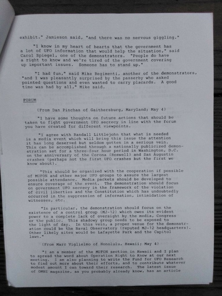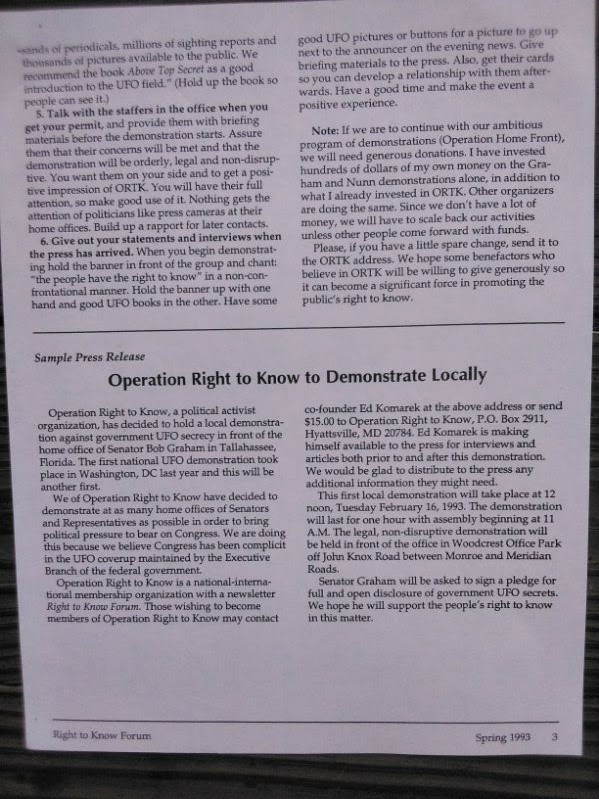 The following pictures were taken by Ed Komarek, Jr. First is a group photo Ed took at the White House sidewalk after a week-long, permitted educational display at the zero point of the White House ellipse. Pics following the first photo are scenes from the display (long table of material, upright display board, large banner on poles). Event during March 1992. Black and white version of White House sidewalk group photo adorned cover of the MUFON Journal during the spring of 1992.