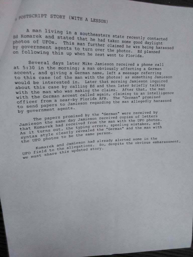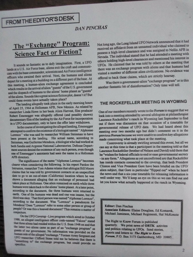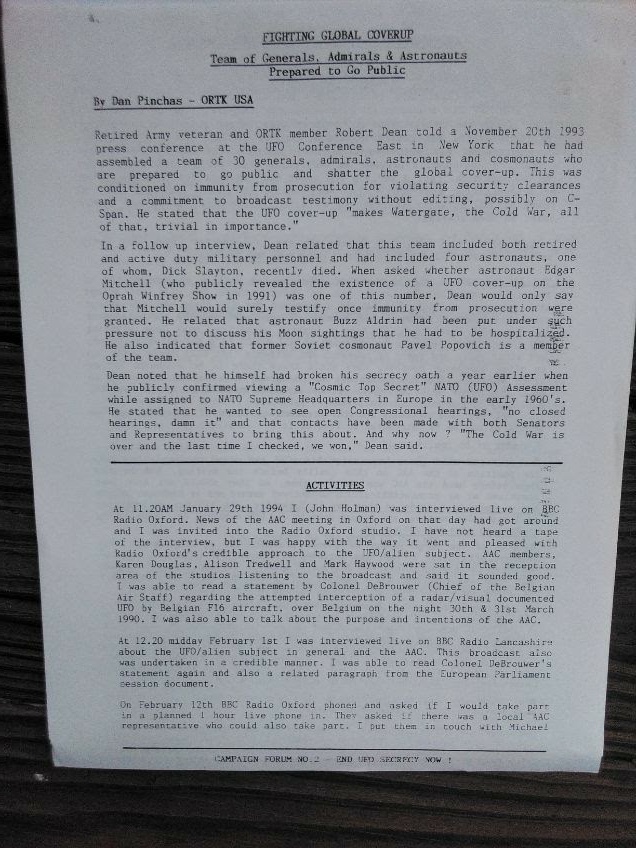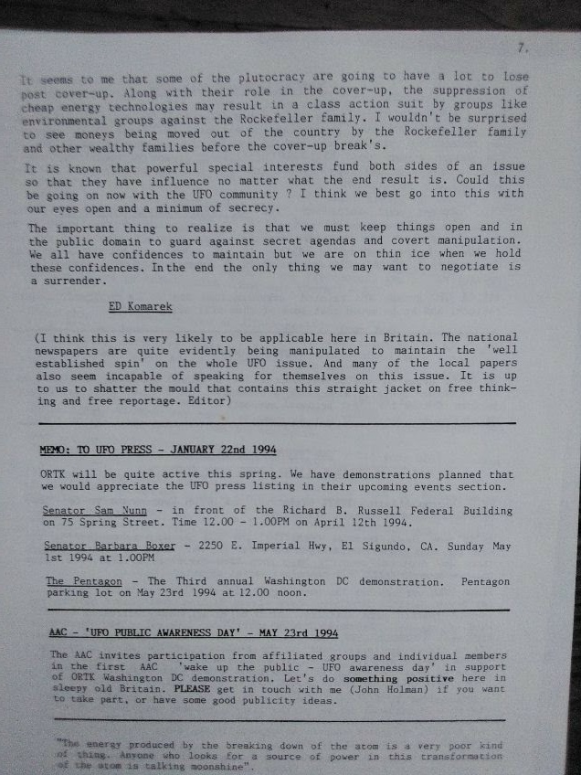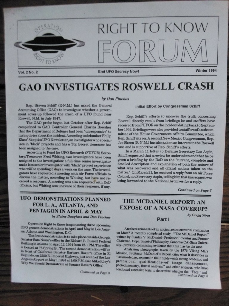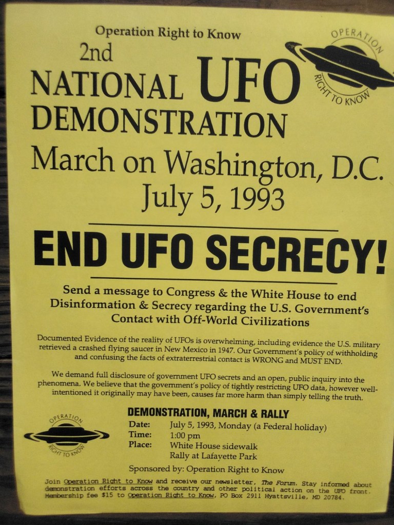 The following pictures were taken by Ed Komarek, Jr. First is a group photo Ed took at the White House sidewalk after a week-long, permitted educational display at the zero point of the White House ellipse. Pics following the first photo are scenes from the display (long table of material, upright display board, large banner on poles). Event during March 1992. Black and white version of White House sidewalk group photo adorned cover of the MUFON Journal during the spring of 1992.